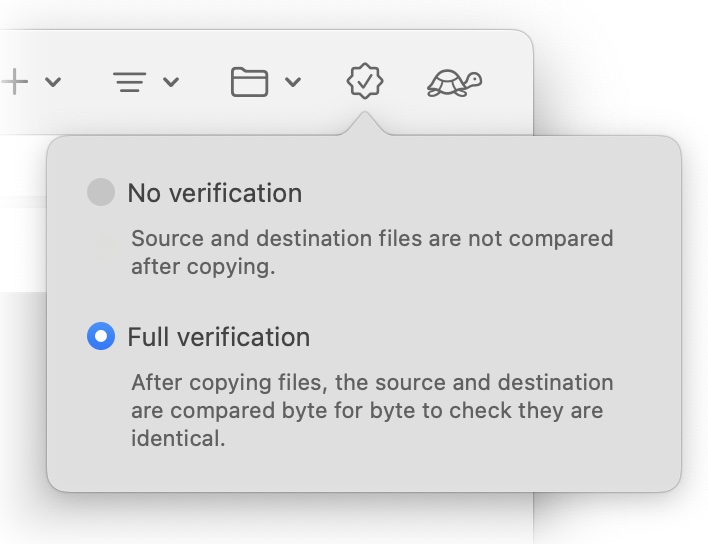 Verification can be enabled at any time. Simply click the Verification button on the toolbar and select the desired verification level to apply to the whole queue. The verification process will be started for a task if it completes the copy process when verification is enabled.